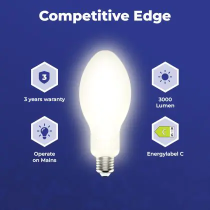Questa lampadina LED HPL di Noxion è stata create specialmente per sostituire la lampade a scarica convenzionali, che sono andate fuori produzione per via dell'elevato consumo di energia e per la presenza di mercurio. Questa nuova alternativa a LED ti farà risparmiare fino al 75% di energia e non contiene né mercurio né altri materiali dannosi per l’ambiente. Inoltre i LED si possono riciclare.